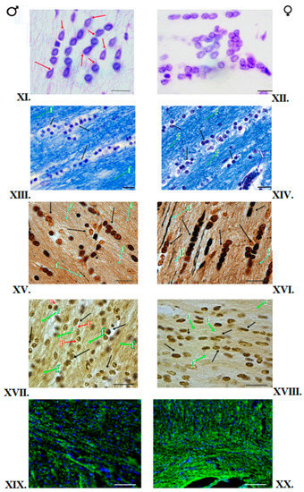 OLGs of the red kangaroo CC. (XI,XII)—Nissl staining (scale bar 10 μm, ↓—OLGs); (XIII,XIV)—Klüver–Barrera staining (scale bar 20 μm); (XV,XVI)—Glial tissue impregnation with silver salts. The traditional arrangement of OLGs in rows (scale bar 20 μm); (XVII,XVIII)—Histochemical method for detection of iron in OLGs (scale bar 20 μm); (XIX,XX)—Immunofluorescence staining for MBP (scale bar 50 μm). Blue nuclei stained with DAPI; Notations: ♂—male; ♀—female; ↓—OLGs; f—the nerve fibers; p—processes of OLGs; the description is in the text.