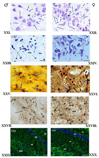 OLGs of the red kangaroo Hip. (XXI,XXII)—Nissl staining (scale bar 10 μm, OLGs—↓); (XXIII,XXIV)—Klüver–Barrera staining (scale bar 10 μm); (XXV,XXVI)—Glial tissue impregnation with silver salts (scale bar 20 μm;); (XXVII,XXVIII)—Histochemical method for the detection of iron in OLGs (scale bar 20 μm); (XXIX,XXX)—Immunofluorescence staining for MBP (scale bar 50 μm). Blue nuclei stained with DAPI; Notations: ♂—male; ♀—female; ↓—processes of OLGs; N—neuron; v—blood vessels; p—processes of OLGs; SO—stratum oriens, SP—stratum pyramidale, SR—stratum radiatum, SLM—stratum lacunosum-moleculare; the description is in the text.