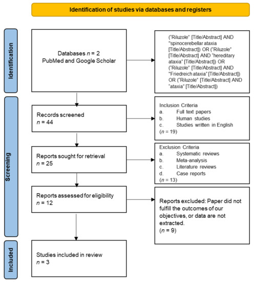 We used the PubMed database for this systematic review. The search was conducted between 24 March 2022 and 31 March 2022. The search terms were: (“Riluzole”[Title/Abstract] AND “spinocerebellar ataxia”[Title/Abstract]) OR (“Riluzole”[Title/Abstract] AND “hereditary ataxia”[Title/Abstract]) OR (“Riluzole”[Title/Abstract] AND “Friedreich’s ataxia”[Title/Abstract]) OR (“Riluzole”[Title/Abstract] AND “ataxia”[Title/Abstract]).
