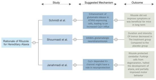 In summary, two out of the three animal/in vivo trials showed the efficacy of riluzole in the treatment of hereditary ataxias, while the last one showed promising results. The initial findings in animal studies justify the continuation of trials on human subjects. Figure 3 shows the main findings of the animal/in vivo studies [15,16,17].