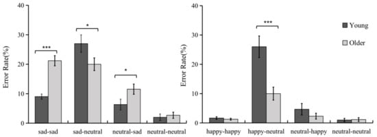 A 2 (Age: young vs. older) × 2 (Emotional faces: happy vs. sad) × 4 (Sequence type: emotional-emotional/emotional-neutral/neutral-emotional/neutral-neutral) repeated measures ANOVA was conducted on error rates (see Figure 2). Results revealed a significant main effect of emotional faces, F(1, 54) = 74.38, p < 0.001, η2 = 0.58, with a significantly higher error rate in the sad condition (12.50 ± 5.24%) than in the happy condition (6.00 ± 5.99%), p < 0.001; a significant main effect of sequence type, F(3, 162) = 69.69, p < 0.001, η2 = 0.56, post hoc comparisons revealed that the error rate on the emotional-neutral sequence (20.70 ± 12.72%) was significantly higher than on the emotional-emotional (8.30 ± 3.74%) and neutral-emotional sequences (6.20 ± 6.73%), and the error rate on the emotional-emotional and neutral-emotional sequences was significantly higher than on the neutral-neutral sequence (1.70 ± 3.74%). The interaction between age and emotional faces was significant, F(1, 54) = 24.45, p < 0.001, η2 = 0.31, and simple effects analysis revealed significant differences in error rates between youth and older adults for both happy and sad conditions. The interaction between age and sequence types was significant, F(3, 162) = 14.47, p < 0.001, η2 = 0.21. Simple effects analysis found significant differences in error rates between young and older on the emotional-emotional and emotional-neutral sequences, and non-significant differences in the other sequences. The interaction between emotional faces and sequence types was significant, F(3, 162) = 12.32, p < 0.001, η2 = 0.19; simple effects analysis found significant differences in error rates across emotional conditions for all three sequences, except for non-significant differences in error rates for neutral-neutral sequences. In addition, the triple interaction of group, emotional faces, and sequence types was significant, F(3, 162) = 12.32, p < 0.05, η2 = 0.051. Further simple effects analysis revealed that on the sad-sad and neutral-sad sequences, the error rate was significantly higher in the older group than in the youth (p < 0.001; p < 0.05); on the sad-neutral sequence, the youth group had an error rate higher than in the older group (p = 0.06). Subjects’ error rates in completing the AX-CPT task in the happy condition were significantly higher in youth than in older adults only on the happy-neutral sequence (p < 0.001). The above results indicate that, in the processing of different emotional information, youth were more inclined to proactive control than older age; in the processing of negative information, older age was more inclined to reactive control strategies than youth; in the processing of positive information, older age showed similar cognitive control patterns as youth, and youth had more proactive control.