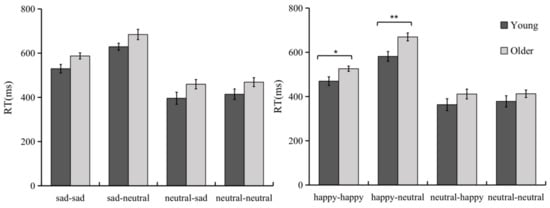 A mixed design of 2 (Age: young vs. older) × 2 (Emotional faces: happy vs. sad) × 4 (Sequence type: emotional-emotional/emotional-neutral/neutral-emotional/neutral-neutral) was used, with the age as a between-subjects variable, emotional faces, and sequence type as within-subjects variables, and dependent variables of error rate and reaction time of correct responses.