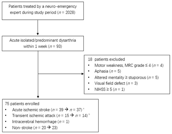Of the 2208 patients treated by a neuro-emergency expert, 75 patients, excluding 18 patients with acute isolated or predominant dysarthria within 1 week, were enrolled in the present study (Figure 1). Two patients with an initial acute ischemic stroke were diagnosed with multiple sclerosis and multiple cranial neuropathies.