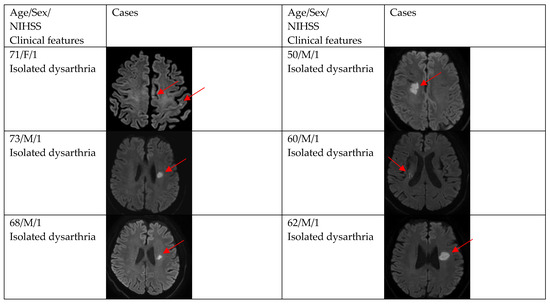 Clinical characteristics and neuroimaging findings of patients with ischemic stroke or TIA presenting with dysarthria only. Except for the bottom two cases, all showed a single lesion on DWI.