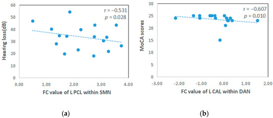 The Spearman correlation analysis indicated that the MoCA scores were negatively correlated with the FC values of the left CAL within the DAN (p < 0.05, Table 3, Figure 3). The degree of hearing loss was negatively correlated with the FC values of the left PCL within the SMN (p < 0.05, Table 4, Figure 3). BDI scores were negatively associated with the FC value of the left Crus1 within the VN (p < 0.05, Table 3, Figure 3).
