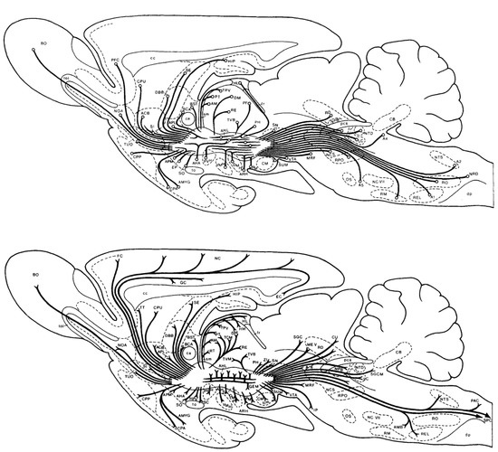 - Nieuwenhuys, R.; Geeraedts, L.M.; Veening, J.G. The Medial Forebrain Bundle of the Rat. I. General Introduction. J. Comp. Neurol. 1982, 206, 49–81. [Google Scholar] [CrossRef]
