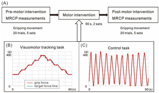 Electroencephalograms (EEGs) were recorded from scalp positions Fz, Cz, Pz, C3, and C4 according to the international 10–20 system with linked earlobes as the reference (using a Polymate2 AP216, Miyuki Giken, Tokyo, Japan). Impedance at all EEG electrodes was less than 5 kΩ. The EEG signals were bandpass-filtered at 0.15–100 Hz, and both EEG and grip force measures were stored on a personal computer at a sampling rate of 500 Hz. MRCPs were recorded during hand grips to a target force of 400 g repeated every 5–7 s at the participant’s own pace. Participants performed 100 of these grip movements (5 sets of 20) before the motor intervention (VM or C) and another 100 grip movements (also in 5 sets of 20) after the intervention.