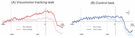 Grand-averaged MRCP waveforms obtained from over the ipsilesional motor cortex (C3 or C4 position of the 10–20 system). (A) MRCPs obtained before and after the visuomotor tracking task of motor intervention. (B) Corresponding MRCPs obtained before and after the control task. In both MRCP measurement conditions, the voltage deflection started about 2 s before movement onset. The MRCP amplitude was greater after the visuomotor tracking task but not after the control task.