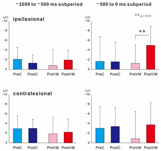 Mean amplitudes of MRCPs recorded within −2000 to −500 ms and −500 to 0 ms subperiods from ipsilesional and contralesional motor cortices before (Pre) and after (Post) the motor intervention (C or VM). In the damaged hemisphere, mean MRCP amplitude after the VM task (Post-VM) was significantly enhanced during the −500 to 0 ms subperiod but not during the −2000 to −500 ms subperiod. There were no changes in MRCP amplitudes during either subperiod after the control intervention. ** p < 0.01, statistical significance compared within two pairs.