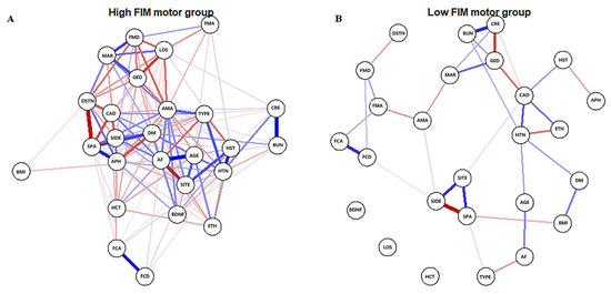 In order to estimate the interrelationship of variables, the Gaussian graphical model was applied to compute the high- and low-FIM networks. We used the same data (as shown in Table 1) from our previous publication that included 26 variables of demographic and clinical characteristics, and serum biomarkers [13]. There were 174 participants in each group, and no significant difference was found between the two groups regarding age, gender, BMI, ethnicity, stroke type, stroke side, HCT, BUN, creatinine level, the occurrence of CAD, diabetes, hypertension, atrial fibrillation (AF), and prior stroke. Moreover, significant differences were found in LOS, discharge destination, serum BDNF level, FIM motor subscores on admission (FMA) and discharge (FMD).