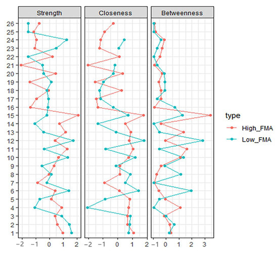 Centrality Indices results of high-FIM network (red) and low-FIM network (blue). Strength represents the quantity of connections, while closeness and betweenness represent the interaction with other nodes.