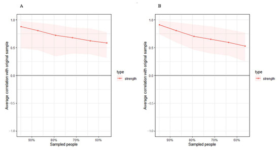 The stability of networks and centrality indices are quite common after network structures estimated. We used the package bootnet to assess the accuracy and used plot function from qgraph to display the results. As to the stability plots of the sample size, the lines represented the average correlations between the percent of given samples and the whole sample size, and the shaded area represented the 2.5 and 97.5 percentiles of the estimated samples [16].
