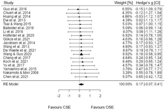 The random-effect model (k = 19), which included all studies with combined effect sizes, showed an estimated overall effect size of g = 0.174 (95% CI [−0.067, 0.415]; SE = 0.119; Figure 2. The estimated effect was not significant (p = 0.157). The analysis of heterogeneity was also not significant (Q(19) = 2.257; p = 1.000; Tau2 = 0.000; I2 = 0%; H2 = 1.000). The lowest effect sizes were negative (g = −0.15 to −0.03, favoring CSE). The highest effect sizes of the model reached g = 0.47 to 0.65. The results of the overall meta-analysis are displayed in the forest plot in Figure 2.