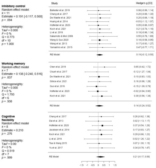 In the subgroup analysis, the effect sizes of the random-effects model for the three EFs (inhibitory control, working memory, cognitive flexibility) were calculated independently. The results of this analysis are shown in the forest plot in Figure 3.