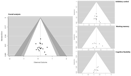 Funnel plots for overall analysis, inhibition, working memory and cognitive flexibility.