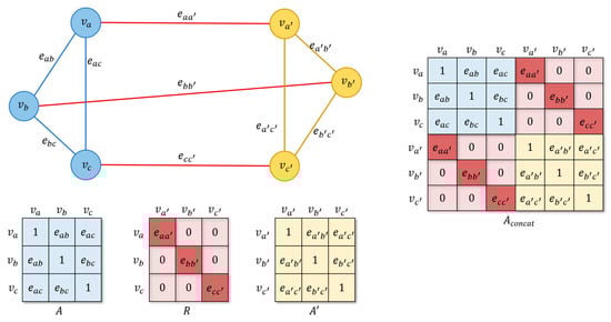 where and represent the signal strength matrix and adjacency matrix of the new graph obtained by concat-fusion. represents the relationship matrix between the subgraphs.