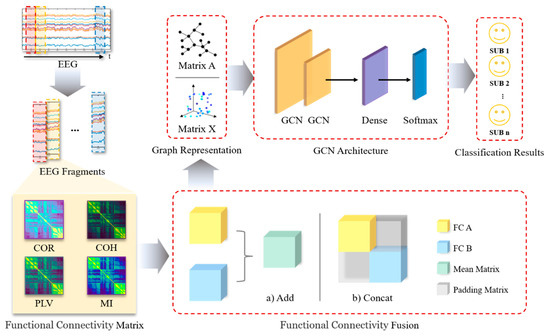 The proposed multi-FC fusion GCN model is shown in Figure 2. Firstly, the original data are preprocessed and segmented. Then, different types of FC matrices are calculated as adjacency matrices. After that, we use the add or concat-fusion to combine multiple FCs and set the padding matrix to the three relationship matrices described in Section 2.3.2. Through the above steps, we obtain a new adjacency matrix. Finally, a two-layer GCN network is employed to realize the classification of identities. The two layers of GCN are respectively defined as: