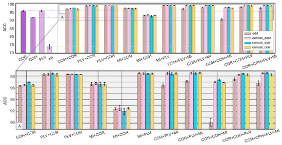 As shown in Figure 3, in the case of two-FC combination, all four fusion methods are more effective than a single FC. The best two-FC combination is MI+PLV with the add-fusion, which achieves an accuracy of 98.51%. However, in the case of three-FC combination and four-FC combination, accuracy is not always higher than that in the two-FC combination. The accuracy of the combination COR+COH+MI with the add-fusion is 90.16%, which is lower than the combination COH+COR (96.36%), MI+COR (96.66%), and MI+COH (92.43%).