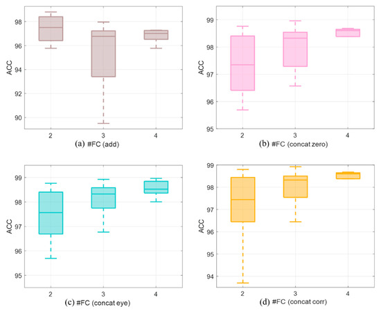 It can be seen in Figure 4a that under the add-fusion, when the number of FCs increases, the accuracy does not improve; the highest accuracy was achieved by two-FC combination. As shown in Figure 4b–d, in all three concat-fusions, the accuracy increases with the number of FCs. This may be due to the difference in the calculation method of add and concat, which is discussed in detail in the discussion section.