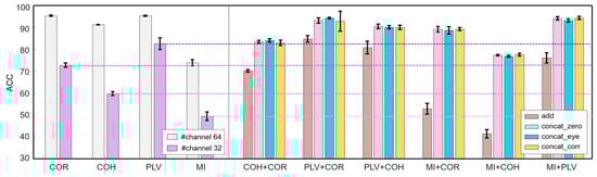 The right figure in Figure 5 shows the accuracy of six two-FC combination under four different fusion methods under 32 channels. It can be seen that when the number of channels is reduced to half of the original, the accuracy of the FC combination using the concat-fusion is improved. Especially in the combination including PLV (PLV+COR, PLV+COH, and MI+PLV), the result is up to 94.26%, which is almost the same as the optimal single-channel under 64 channels. However, the result of using the add-fusion is not as good as a single FC, except for the combination PLV+COR.