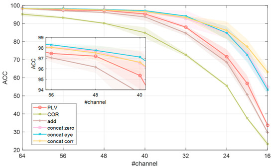 In further exploration, to study the trend of performance when the number of channels is reduced, we give the accuracy of our method (PLV+COR) at a different level of channel reduction (64, 56, 48, 40, 32, 24, 20 and 16 channels remain); see Figure 6 and Table 5.