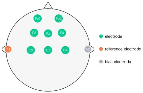 The rehabilitation training system used in this study was the new L-B300 EEG Acquisition and Rehabilitation Training System. In this system, the patient wore an 8-lead EEG cap with electrodes over the left and right prefrontal cortex (FP1, FP2), left and right frontal cortex (F3, F4), left and right central area (C3, C4), frontal midline area (Fz), and central midline area (Cz), respectively. The electrode placement was in line with the 10/20 international standard lead system [], as shown in Figure 1. The left and right ear clip electrodes (A1 and A2) were, respectively, the reference and bias electrodes. The patients’ bilateral upper/lower limbs were fixed on the corresponding left and right rotary shafts of the system for upper/lower limb rehabilitation training. The system provides a training mode, in which the equipment was driven completely by the patient’s EEG signals generated through the subject’s motor imagery (MI). The display screen in the device established a visual feedback platform between the system and the patient. When the patient intended to perform upper/lower limb exercise training, the researcher needed to set the virtual character on the display screen to the corresponding exercise preparation. Thus, in upper limb training, the virtual character was displayed for swimming preparation, whereas for lower limb training, the display was for cycling preparation. The patient carried out the corresponding motor imagery tasks according to the virtual character training type on the display screen and followed the voice prompt. When the patient’s Mscore [] (the specific EEG signals) reached a certain threshold, the virtual character on the display screen began to move accordingly. At the same time, the rotary shafts of the system began to rotate to drive the patient’s limbs to move accordingly. When the patient’s motor intention fell below the set threshold, the virtual character on the display screen stopped its corresponding motion, and the rotary shafts stopped rotating, thus ceasing to drive the patient’s limbs.