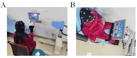 BCI training. (A) A patient with right hemiplegia undergoing upper limb BCI training (imagined swimming) (B) The same patient undergoing lower limb BCI training (imagined cycling). In the safety evaluation of the system, the three patients were observed and evaluated for any discomfort, seizures, recurrent cerebral hemorrhage, and cerebral infarction during training.