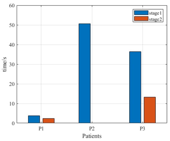 All three testing phase patients received four training sessions of the system over two days. The first two sessions and the second two sessions for each patient were counted as stage 1 and stage 2, respectively. In the four training sessions, the CMSST of the three patients was 17.8 ± 21.0 s (range 0.1 to 50.7 s), and the indicator value at stage 2 was lower than that in stage 1, as shown in Figure 3.