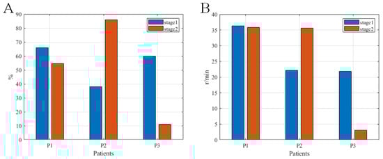 The motor state percentages (A) and the effective training revolutions per minute (B) of the three test patients in upper limb training at the two stages of training.