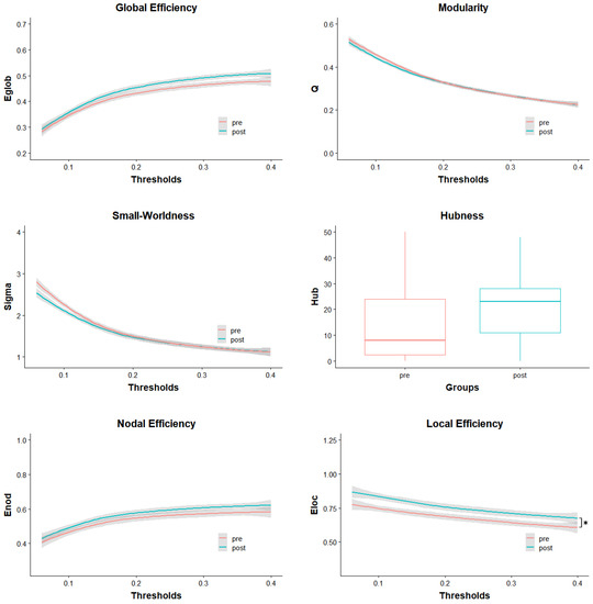 Pre- and post-test distribution of parameters over the full range of used thresholds. The grey areas indicate the standard deviations. In the case of Hubness, the groups are represented in a boxplot. Enod = Nodal Efficiency; Eloc = Local Efficiency; Eglob = Global Efficiency; Q = Modularity; Sigma = Small-Worldness; Hub = number of Hubs; * = significant difference.