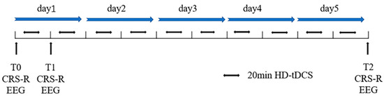 The stimulation protocol was performed by a direct current stimulator (Neuroelectrics, Barcelona, Spain) consisting of one anodal electrode and four cathodal electrodes. The anodal electrode was placed over the left DLPFC (F3 in the 10–20 international system EEG placement), and the four cathodal electrodes (AFz, FCz, F7, and C5 in the 10–20 international system EEG placement) were placed around the anodal electrode to form a current loop. The current was ramped up to 2 mA over 30 s before the start of the experiment. Then, the current was maintained for 20 min, and slowly ramped down over 30 s after stimulation. As shown in Figure 1, all patients received ten HD-tDCS sessions for five consecutive days, and the patients’ CRS-R scores and EEGs were recorded before the experiment (T0), after a single HD-tDCS session (T1), and after the final treatment (T2).