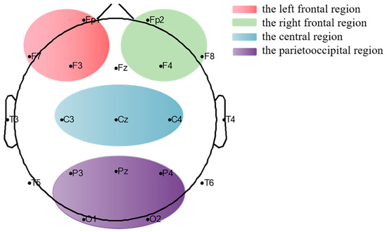 We divided the brain into four cortical regions: left frontal, right frontal, central, and parietooccipital regions [39,40]. As shown in Figure 2, the left frontal region included electrodes Fp1, F3, and F7; the right frontal region included electrodes Fp2, F4, and F8; the central region included electrodes Cz, C3, and C4; and the parietooccipital region included electrodes Pz, P3, P4, O1, and O2. Research has shown that theta and alpha bands are associated with working memory processing and improved consciousness [14,41,42,43]. Previous results from our team showed that changes in theta power and alpha power were positively correlated with changes in CRS-R scores [7]. Meanwhile, it has been found that anodal tDCS can induce changes in the frontoparietal network and the frontal part of the default mode network [44,45]. Therefore, data were calculated in the following frequency bands: theta (4–8 Hz) and alpha (8–13 Hz) [46]. The left frontal–parietooccipital region PLV was calculated using pairwise electrodes from the left frontal and parietooccipital regions. The intra-bifrontal PLV was also calculated. The connectivity between paired channels in each frequency band was computed using phase synchronization, which was described as follows: for each epoch EEG signal, the instantaneous phases ϕx(t) and ϕy(t) of the paired channels were evaluated based on the Hilbert transform. Then, the phase difference was defined by