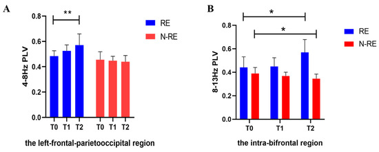With the increase of stimulation, the PLV of the RE and the N-RE groups showed different changes (A) in the left-frontal-parietooccipital region at 4–8 Hz, (B) in the intra-bifrontal region at 8–13 Hz; PLV, phase locking value; RE, responsive group; N-RE, non-responsive group; T0, before the experiment; T1, after a single HD-tDCS session; T2, after the treatment of 5 days. * p < 0.05. ** p < 0.01.