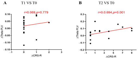 ΔCRS-R, the increases in the CRS-R scores at T2/T1 compared with T0; ΔPLV, the increases in PLV at T2/T1 compared with T0; Comparison of T1 and T0 in the left-frontal-parietooccipital region at 4–8 Hz for all patients (A); Comparison of T2 and T0 in the left-frontal-parietooccipital region at 4–8 Hz for all patients (B); T0, before the experiment; T1, after a single HD-tDCS session; T2, after the treatment of 5 days. CRS-R, Coma Recovery Scale-Revised; PLV, phase locking value.