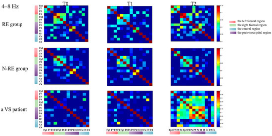 The PLV of the RE group, N-RE group and a VS patient (NO.8) at different times in each channel at 4–8 Hz. RE, responsive group; N-RE, non-responsive group; T0, before the experiment; T1, after a single HD-tDCS session; T2, after the treatment of 5 days. PLV, phase locking value.