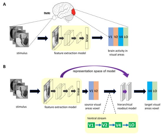 An important aspect of cognitive neuroscience is modeling the human brain’s response to external stimuli and predicting the corresponding brain activity. Models that predict the brain’s response to external stimuli are known as visual encoding models [,]. Currently, some DNN-based visual encoding models have achieved the best predictive performance. DNN was initially inspired by how the brain’s feedforward visual system processes visual information []. Here, DNN-based visual encoding models assume that the voxels activity in the brain can be modeled as a linear combination of the activity artificial neurons in DNN. According to different driving modes, existing DNN-based visual encoding models can be divided into two categories: goal-driven visual encoding models and data-driven visual encoding models.
