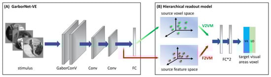 Briefly, the GaborNet-VE consists mainly of a Gabor convolutional layer, two regular convolutional layers, and one fully connected layer (see Figure 2A). The Gabor convolutional layer contains 128 Gabor kernels, including 64 Gabor kernels of the real and imaginary types. The size of each Gabor kernel is 9 × 9. The model realizes the learning of deep network features based on Gabor features via replacing regular convolution kernels in the first convolutional layer with parameter-learnable Gabor kernels. The dimensions of the feature matrix output by the three convolution layers are 128 × 62 × 62, 128 × 31 × 31 and 128 × 16 × 16, respectively, and these features are shown to have good expressiveness and effectiveness for low-level visual areas []. The last fully connected layer is used as the linear readout model to realize the linear mapping from the feature space to the voxel space. The GaborNet-VE can achieve excellent prediction performance in early visual areas (V1, V2 and V3). Hence, we take the GaborNet-VE as the first sub-model in the proposed framework.