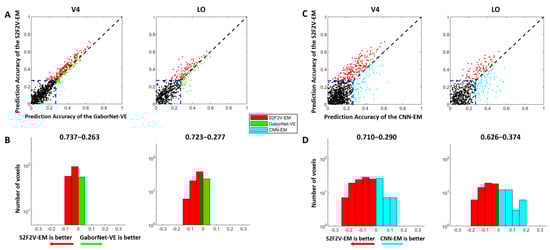 The comparison of encoding performance between the S2F2V-EM and the GaborNet-VE is shown in Figure 4A,B. In the scatter plot (Figure 4A), we find that the S2F2V-EM is significant for both V4 and LO compared to the GaborNet-VE. In addition, the number distribution (Figure 4B) shows that the proportion of S2F2V-EM advantage voxels exceeded 72%. The comparison of encoding performance of the S2F2V-EM and the CNN-EM is shown in Figure 4C,D. For the visual area V4, we find that the S2F2V-EM shows significant advantages over the CNN-EM. The performance of the two models in the visual area LO is slightly different. Collectively, compared with the GaborNet-VE and the CNN-EM, we find that S2F2V-EM achieves the best encoding performance in V4 and LO.