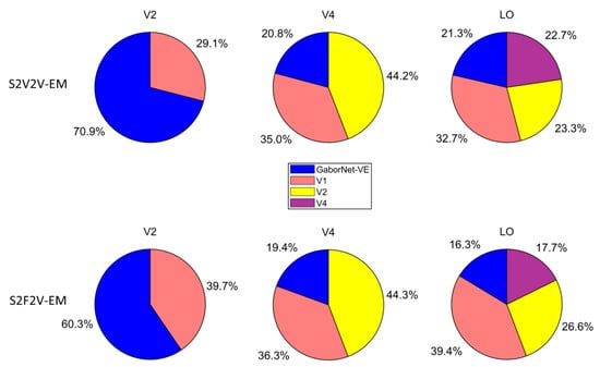 The proportion of best-encoded voxels for different encoding models is shown in Figure 5. For the visual area V2, most of the voxels are best encoded by the GaborNet-VE. For the visual area V4, most of the voxels are best encoded by S2V2V-EM based on V1 and V2. For the visual area LO, most of the voxels are best encoded by S2V2V-EM based on V1, V2, and V4. In addition, S2F2V-EM and S2V2V-EM are similar in their results. These results show that the encoding models based on the hierarchical ventral stream-optimization neural network have obvious advantages in high-level visual areas, which can more accurately predict the voxel activity compared with the GaborNet-VE. However, the performance in the V2 is not as good as that of the GaborNet-VE, which suggests that the hierarchy of representations in the ventral stream cannot improve the model’s performance in low-level visual areas.
