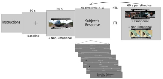 During the main experiment, after reading the instruction screen, the baseline signal (eyes open looking at the cross mark) was recorded for 80 s. Then, 11 one-minute multimedia stimuli (two non-emotional and nine emotional videos) were presented. One non-emotional video was presented just after the baseline recording, whereas another non-emotional video and nine emotional videos, selected randomly out of 16 emotional videos, were presented in random order. The second non-emotional video was presented at some point between the fifth and eighth videos. Every stimulus video was preceded by an inter-stimulus interval and followed by response windows to respond on self-assessment scales: valence, arousal, dominance, liking, familiarity, relevance, and emotional category selection. Valence, arousal and dominance scales ranged, respectively, from unpleasant (1) to pleasant (9); inactive (1) to active (9); and submissive (1) to dominant (9). Liking, familiarity, and relevance scales ranged, respectively, from least (1) to fair (3) to much (5); less-familiarity (1) to high-familiarity (5); and from not related (1) to completely related (5). Emotional categories were presented in the form of a drop-down menu. The complete paradigm is shown in Figure 1. Particularly, physiological arousal is the activation state of emotion, which ranges from inactive to active state Russell and Mehrabian [37]. On the other hand, dominance ranges from feelings of total lack of control or influence on events and surroundings to the opposite extreme of feeling influential and in control [37].
