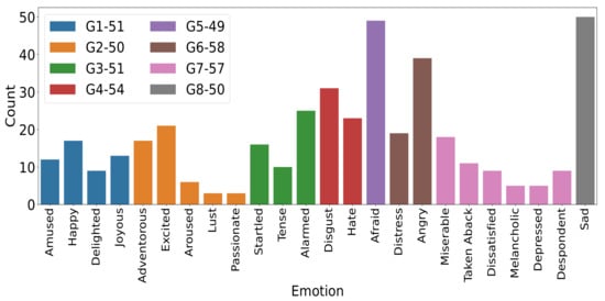 Representation and statistics of emotion groups: The histogram plot shows the number of time participants has rated any emotion category to express their emotional experience. Histogram bars in the same color form an emotion group. The legend shows the number of emotional instances per emotion group. The grouping criteria is described in Section 2.5.1. G1: happy, amused, delighted, joyous; G2: aroused, adventurous, excited, passionate, lust; G3: startled, tense, alarmed; G4: disgust, hate; G5: afraid; G6: distress, angry; G7: miserable, taken aback, dissatisfied, melancholic, depressed, despondent; G8: sad.