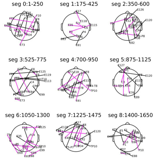 The duration of the extracted EEG signal corresponding to each emotional event was 7 s. The sampling rate was 250 Hz. Each emotional event signal was divided into segments containing 250 samples (75 samples overlapping). The segmenting was based on the recent work by Lettieri et al. [32]. Like them, we also considered a 33% overlap between consecutive windows. In this way, we obtained nine segments to perform further analyses. Segments are: seg-0 (1–250); seg-1 (175–425); seg-2 (350–600); seg-3 (525–775); seg-4 (700–950); seg-5 (875–1125); seg-6 (1050–1300); seg-7 (1225–1475); seg-8 (1400–1650).