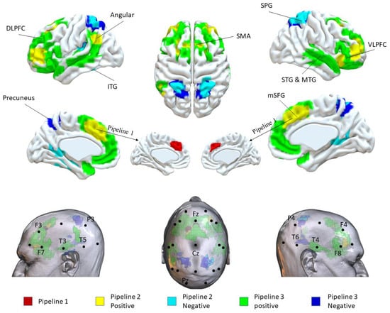 The results of the three pipelines were mapped onto a standard brain and a standard head with the international 10–20 system in MNI space using Surf Ice (www.nitrc.org/projects/surfice/, accessed on 11 November 2020) and MRIcroGL.