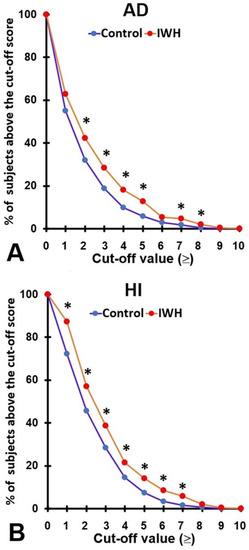 Compared to the control group, the overall ADHD Rating Scale scores and those of the attention deficit and hyperactivity, impulsivity subscales were significantly higher in the IWH group (See Table 2). Figure 1 shows the percentages of subjects that score positive for AD (Figure 1a) or HI (Figure 1b), according to different cut-off values. Significant higher percentages were reported for the IWH group across all cut-off points and the observed differences were almost always statistically significant. Most notably are the cut-off values ≥ 4, proposed by Kooij et al. [41], and ≥ 5, in accordance with the DSM-5 [42]. For these cut-off values, the percentage of individuals that score positive for AD or HI were also significantly higher in the IWH group (See Table 2 and Figure 1).