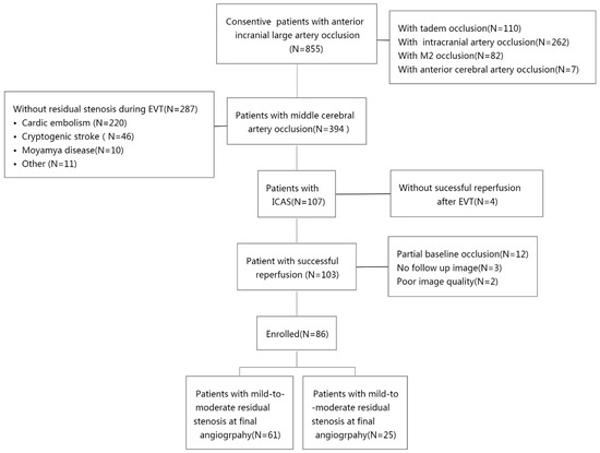 This study included 855 acute anterior circulation stroke patients, of whom 394 had an occlusion on the middle cerebral artery. Of the 394 patients, 107 were included with a diagnosis of ICAS, and 103 out of the 107 patients were further included with successful reperfusion after EVT. Next, 17 out of the 103 patients were excluded due to partial baseline occlusion (N = 12), no follow-up imaging (N = 3), or poor imaging quality (N = 2). Therefore, a total of 86 patients were selected for the study. All patients received tirofiban treatment. No patients received endarterectomy, which is one treatment for carotid artery stenosis [15] in this cohort. The patient selection process is detailed in Figure 1 and a detailed decision-making flow chart is depicted in Figure 2.