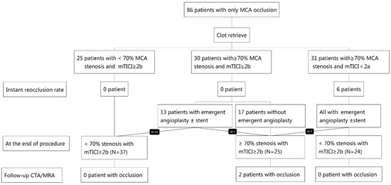 - Wu, C.; Chang, W.; Wu, D.; Wen, C.; Zhang, J.; Xu, R.; Liu, X.; Lian, Y.; Xie, N.; Li, C.; et al. Angioplasty and/or Stenting after Thrombectomy in Patients with Underlying Intracranial Atherosclerotic Stenosis. Neuroradiology 2019, 61, 1073–1081. [Google Scholar] [CrossRef]