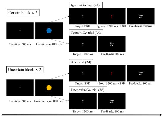 The formal task included two certain blocks and two uncertain blocks (Figure 1). Each block included 60 trials, and the order of blocks was counterbalanced across participants. In the certain blocks, the task was the same as that in the pretest task on Certain-Go trials, but the arrow randomly changed from white to red (i.e., the “Stop” signal) on 40% of trials (Ignore-Go trials). The context cues in the certain blocks were blue circles, which indicated that participants should ignore the “Stop” signal and respond to the direction of the arrow. After each trial, feedback was presented for 800 ms, informing participants that their responses were “correct” (pressed the correct key), “wrong” (pressed the wrong key), or “slow” (pressed the right key but RT > baseline RT). In the uncertain blocks, participants still performed the same button-press task, except that the arrow randomly changed from white to red (i.e., the “Stop” signal) on 40% of trials (“Stop” trials). The context cues in the uncertain blocks were yellow circles, which indicated that participants should inhibit their ongoing response when they saw the “Stop” signal. The feedback on “Stop” trials was “correct” (no key press), or “wrong” (key press, regardless of whether it was correct). The time delay between the “Go” stimuli and the “Stop” signal, defined as the stop-signal delay (SSD), was initially 300 ms and varied among trials. In certain blocks, the SSD was randomly selected in the range of 50–500 ms. In uncertain blocks, this was done through a tracking procedure that converged on the critical SSD, where participants successfully inhibited responses on  50% of the “Stop” trials. After a successful “Stop” trial, the next “Stop” trial was made more difficult by adding 50 ms to the SSD; if inhibition failed, then the next “Stop” trial was made less difficult by subtracting 50 ms from the SSD. The range of the SSD in uncertain blocks was 50–500 ms. To prevent strategic slowing, participants received performance feedback at the end of each block. If accuracy was less than 85%, the feedback was “Your response accuracy is relatively low; please increase your accuracy!”; if the mean RT was slower than the baseline RT, the feedback was “Your time to response is relatively long; please speed up!”; otherwise, the feedback was “Your performance is excellent; please keep it in that way.” Before the formal test started, each participant underwent 10 training trials to become acquainted with the tasks in each type of block.