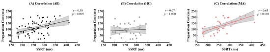 Scatter plots of preparation cost and SSRT with regression lines and 95% CIs in all participants (A), and the HC (B) and the MUD groups (C). Note: CI, confidence interval; r, Pearson correlation coefficient; p values corrected by FDR.