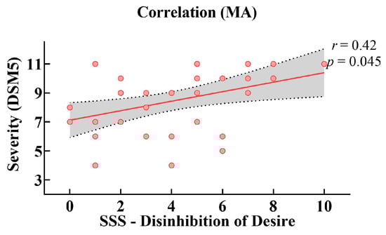 Additionally, a relationship between sensation seeking and the severity of addiction was found in the MUD group. Pearson correlation analysis indicated that the Disinhibition of Desire subscale of the Sensation Seeking Scale was negatively correlated with severity measured by DSM-V in the MUD group (r = 0.42, p = 0.045; FDR-corrected) (Figure 5), indicating that stronger sensation seeking was accompanied by poorer reactive inhibitory control.