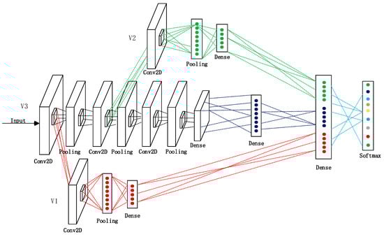 where denotes the value of the th element in each convolutional region, and ,. After passing through the third convolutional layer, the pooling feature formed a feature map with the dimensions of . As the input of V3, underwent the same operations as in V1 to form middle-level features. Subsequently, after passing through the fourth pooling layer and fifth convolutional layer in V3, the output of V2 was a feature map with the dimensions of , which was the top-layer feature. Finally, , , and were fused into a high-dimensional composite feature by the last fully connected layer of V3.